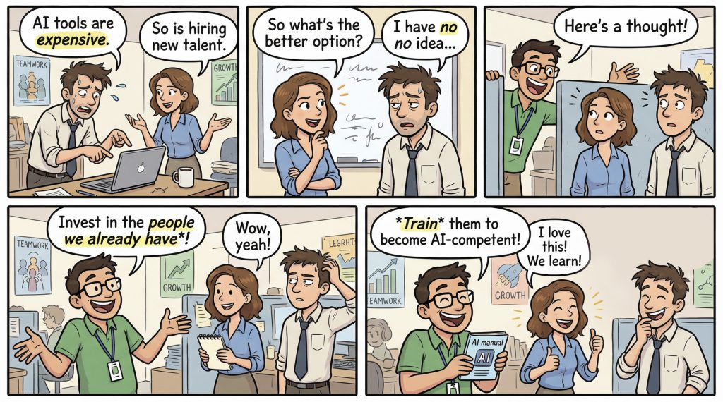 But those companies that make it their mission to invest in people at this time, building cross-functional collaboration, and transforming existing employees into AI-competent professionals will be far more successful in navigating the AI challenge than those who are heavily trying to hire from outside to augment their team!