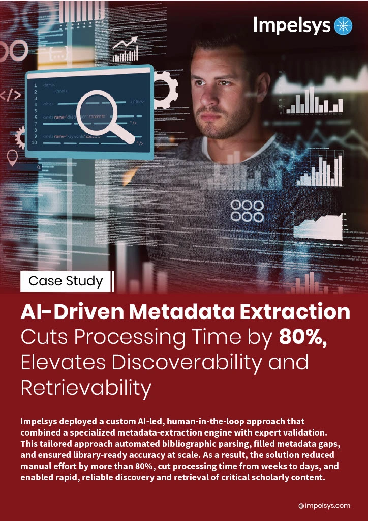 Impelsys implemented a hybrid AI-led approach with human-in-the-loop to address the customer’s complex metadata needs. Our AI tool, fine-tuned for bibliographic patterns, performed the initial parsing and classification of thousands of PDFs. Automated validation and templating scripts streamlined repetitive tasks and ensured consistency, complementing the AI engine. The team then carried out targeted quality checks and enriched any incomplete records, delivering library-ready metadata with exceptional accuracy and speed.