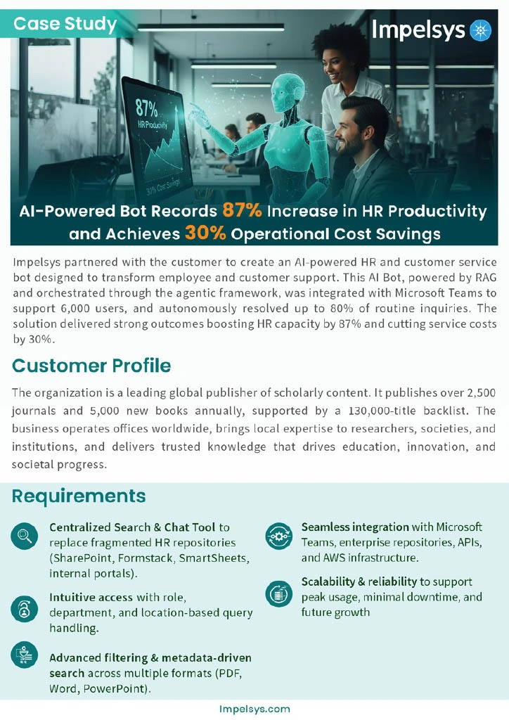 Impelsys created an AI-powered HR and customer service bot integrated with Microsoft Teams, enterprise repositories, and HR email systems. The AI bot leveraged Retrieval-Augmented Generation (RAG) and the agentic framework to deliver precise, context-aware responses, autonomously resolve routine inquiries, and escalate complex cases. Beyond query handling, it provided an Analytics Dashboard for tracking engagement and resolution effectiveness, along with proactive multichannel support that ensured smooth transitions across Teams, email, and ticketing systems.