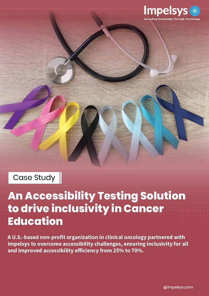 Impelsys devised a comprehensive strategy for addressing accessibility by conducting manual assessments in line with WCAG 2.0 A and AA standards. The testing encompassed various devices and browsers, utilizing tools such as X-ray, Jira, AXE, NVDA, and Lighthouse to ensure effective test-case management, defect tracking, and accessibility.