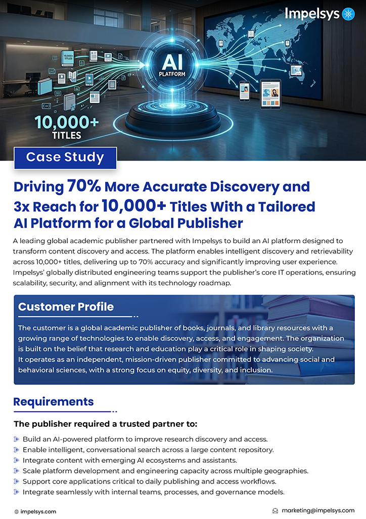 Impelsys enabled the development of an AI platform that supports intelligent discovery across 10,000+ titles. Built using Retrieval-Augmented Generation (RAG) and Model Context Protocol (MCP), the platform allows approved AI assistants to securely access, interpret, and recommend trusted content. The solution improves search relevance and creates a more interactive user experience. It also establishes secure retrieval and agent interfaces that enable AI-driven discovery, citation, and recommendation while maintaining governance and access controls.