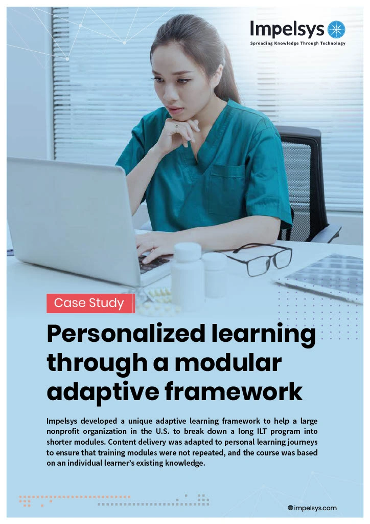 Impelsys proposed a modular adaptive framework that would provide a flexible learning framework based on specific learning outcomes. This allowed us to break the content into ‘bite-sized’ chunks, test the learner on their knowledge level and offer what is relevant for each learner thereby adapting the course to scaffold the learner’s existing knowledge and skills. This solution was based on a pre-assessment that tested the learner’s existing knowledge of the topics and accordingly adapted the learning journey.