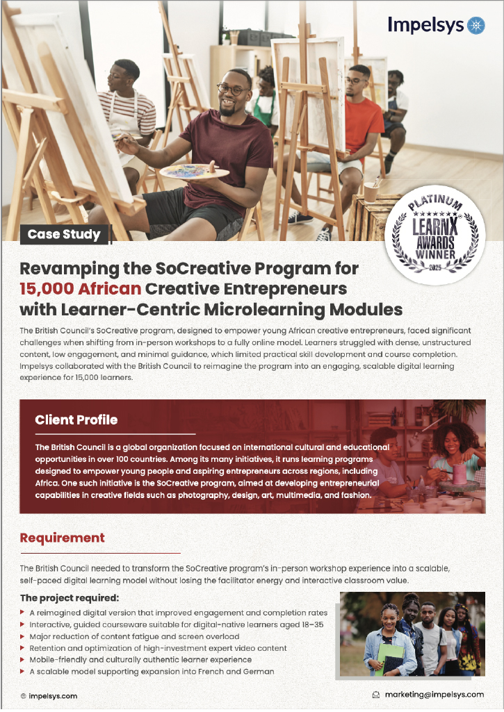Impelsys transformed the SoCreative program’s original 25+ hours of static content into an 8-hour interactive microlearning program with 9 to 10-minute modules, scenario-based exercises, and facilitator-style guidance for 15,000 learners. Culturally relevant visuals and African-context examples strengthened learner connection, while optional legacy videos provided depth without overwhelming learners. The platform was mobile-optimized, ensuring accessibility and engagement even in low-bandwidth environments.
