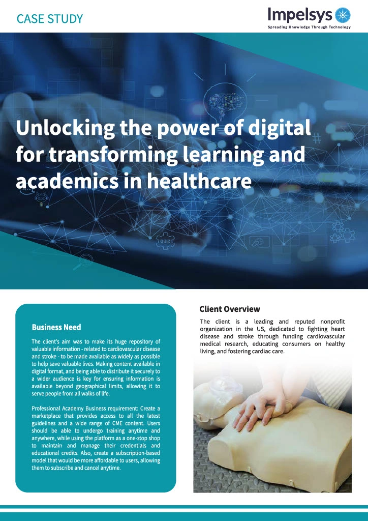 Imeplsys’ expertise in technology, e-learning, content engineering, and digital learning platforms helped the client reach a global audience. The implementation of a continuing education academy with subscription-based plans for medical professionals significantly increased their revenue. The client transformed from a traditional medical education provider to a digital-first research organization with a new-age online academy.